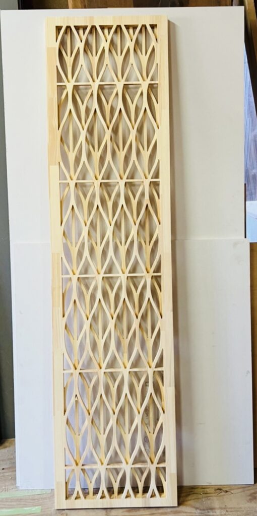 NCルーターで一枚の板から表裏一体の北欧らしいデザイン組子のような商品ができないか、試作を繰り返していました。